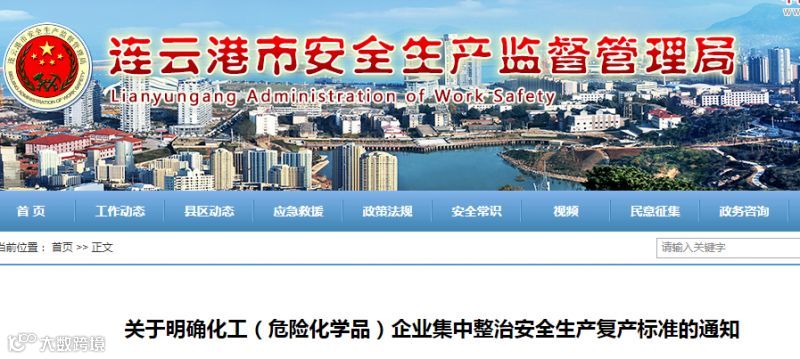 8月7日,连云港市安监局发布:关于明确化工(危险化学品)企业集中整治安全生产复产标准的通知。