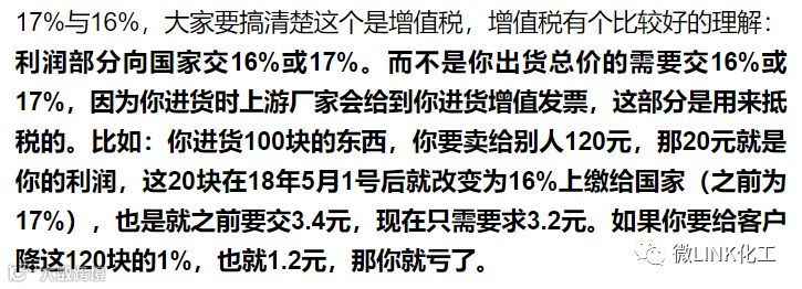 关于5月1日增值税税率降低为16%,化工原料采购部门受公司要求降价,化工原料供应商试图阐述说明,双方博弈不亦乐乎,折腾消耗的时间成本,人力成本早已超过那一点税收调整。