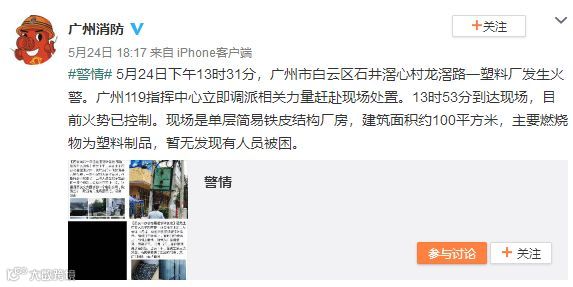 昨天(5月24日),在广州市白云区八方物流城后面的一间塑料厂发生一起火灾,现场冒出滚滚浓烟,如海啸般涌出。接到报案后,消防中心迅速前往事发现场进行救援... 网友提供的视频及图片 事发后广州消防发出通报 5月24日下午13时31分,广州市白云区石井滘心村龙滘路一塑料厂发生火警。广州119指挥中心立即调派相关力量赶赴现场处置。13时53分到达现场,目前火势已控制。现场是单层简易铁皮结构厂房,建筑面积约100平方米,主要燃烧物为塑料制品,暂无发现有人员被困。