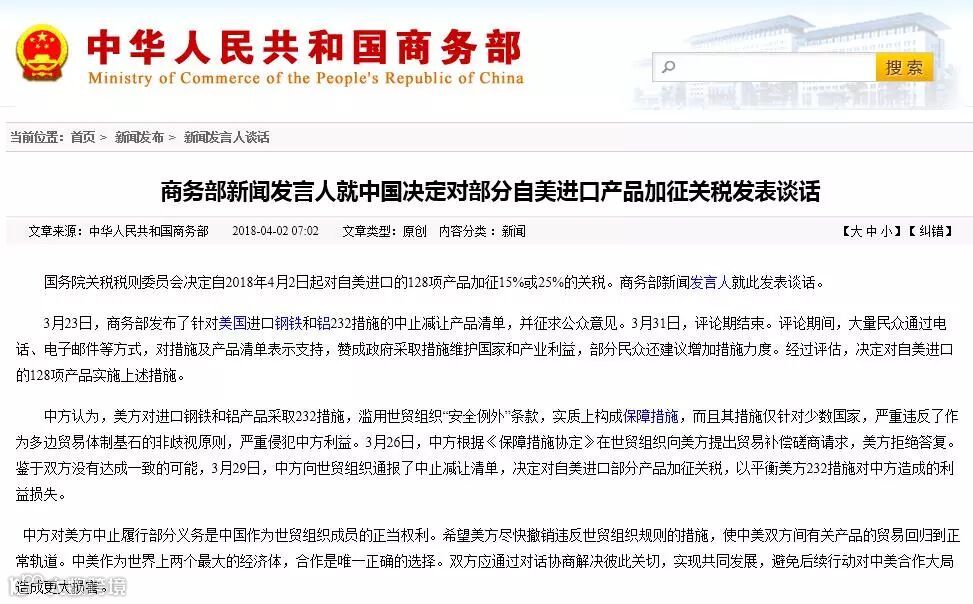 4月1日半夜,中国宣布对自美进口的128项产品加征15%或25%关税。针对美国此前对进口钢铁和铝产品加征关税的回击,正式落地。
