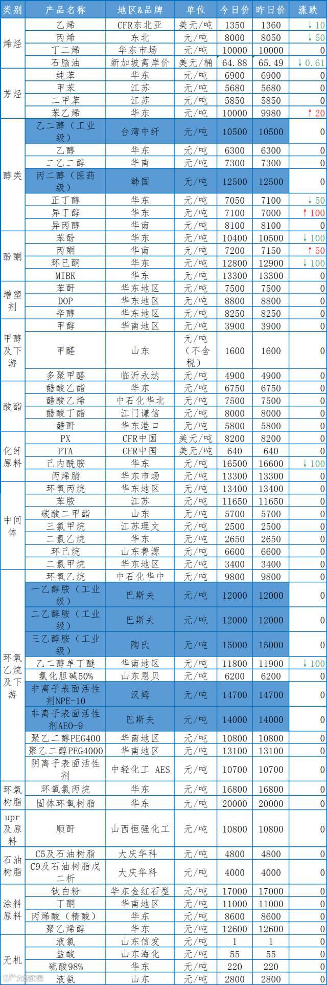 聚乙二醇:出厂价下调100元/吨,目前出厂价在10200-12500元/吨;市场价下调500-700元/吨,目前市场价在10600-12600元/吨。
