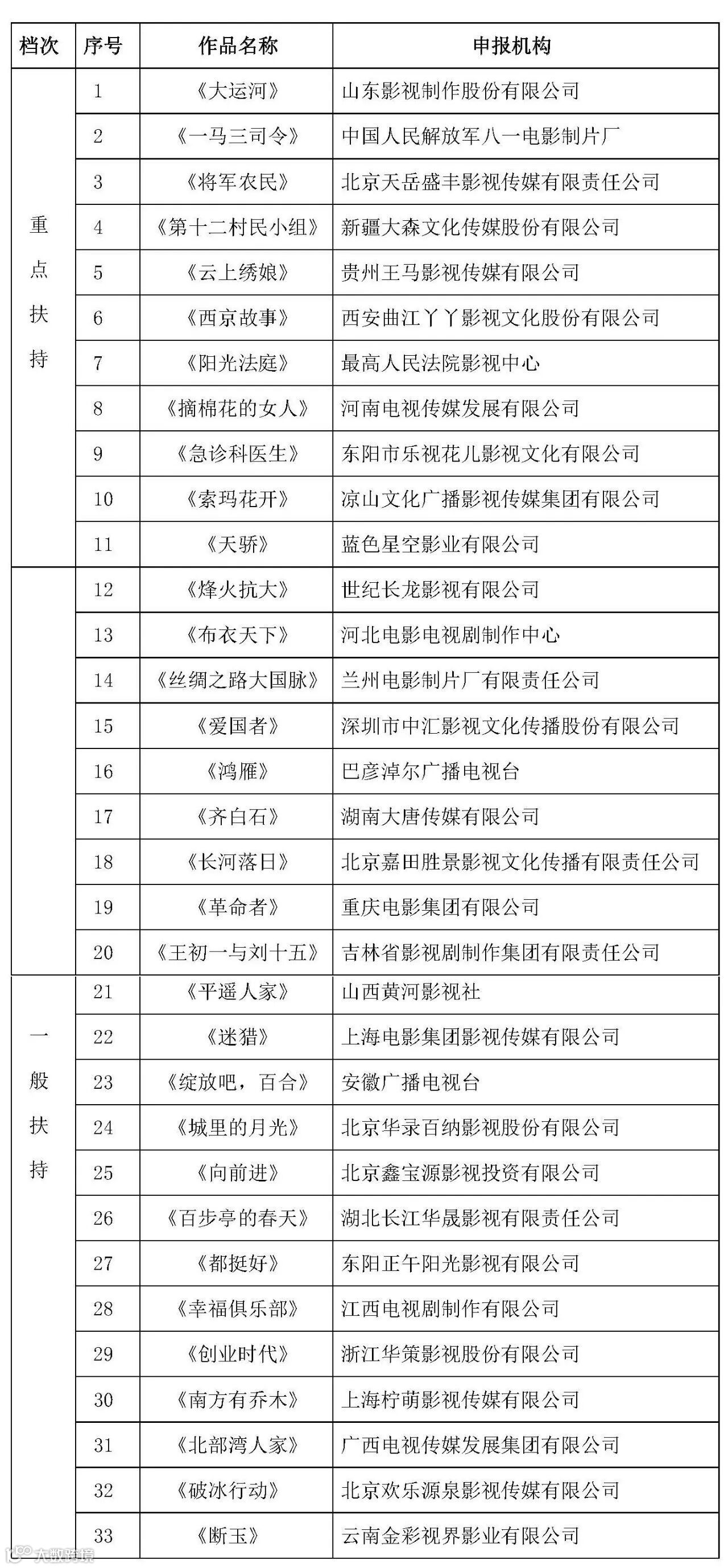 根据《电视剧精品发展扶持专项资金项目评选章程(暂行)》(新广电发﹝2017﹞185号)和《关于2017年度电视剧精品发展扶持专项资金剧本扶持项目申报评审工作的通知》(新广电办发﹝2017﹞36号)确定的原则和标准,2017年度电视剧精品发展扶持专项资金剧本扶持项目评审委员会进行了评审并公示,最终确定了2017年度电视剧精品发展扶持专项资金剧本扶持项目33项。现将评审结果予以公布。(详见附件)
