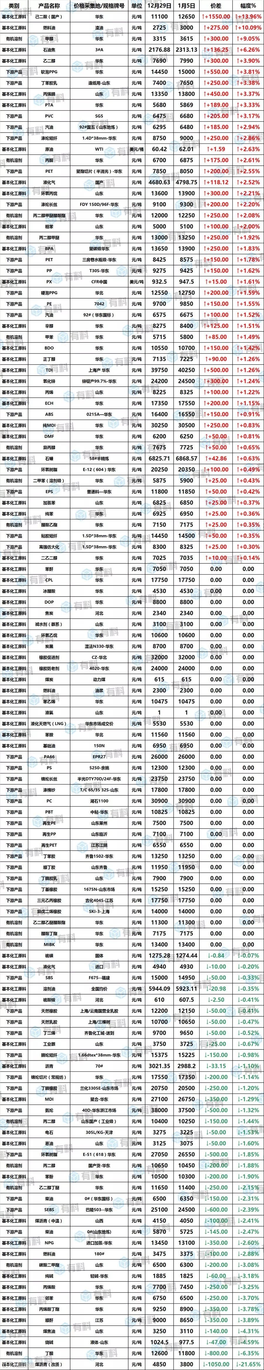 主要化工品涨跌排行榜