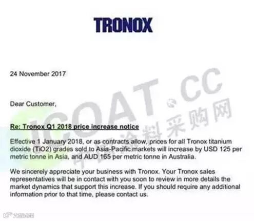 特诺(Tronox)宣布2018年1月1日起,将对所有Tronox二氧化钛(Tio2)产品实行涨价,或另见合同要求。