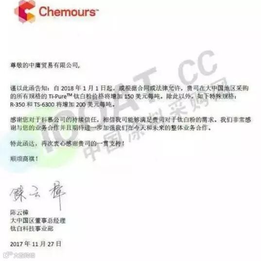 ◆ 2018年1月1日起,或根据合同法律允许,贵公司在大中国地区采购的所有规格的Ti-Pure™钛白粉价格将增加150美元每吨,除此之外,如下特殊规格:R-350和TS-6300将增加200美元每吨。