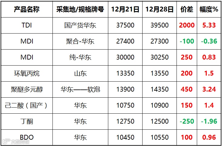 聚氨酯产业链相关产品周度价格表(元/吨)