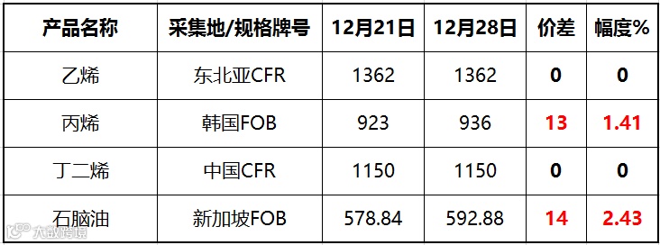 乙烯:临近年底市场参与者谨慎观望市场,乙烯现货价格维持高位,市场交投平平。部分韩国PE石化企业已降低生产负荷,日本石化企业在低库存情况下欲将维持高产量。上周四,台塑因火灾关闭了其在德克萨斯州年产能68.1万吨的烯烃装置,关于其重启时间暂无确切消息。供应略紧支撑乙烯高位运行,但价格高位决定继续冲高有限,预计下周亚洲乙烯高位震荡为主。