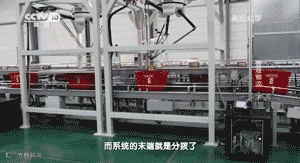 流水线两边很多播种机器人,通过真空吸盘,把周转箱内的商品吸到快递包装箱里。