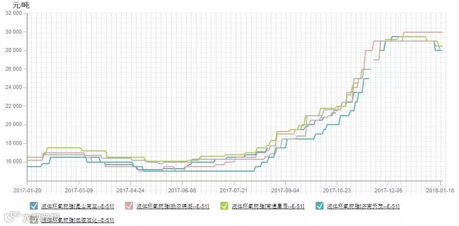 囤货不囤货,咱先看看全年走势图:从走势图可以看出,环氧树脂的出厂价在2017年7月20日之前都是稳定在15000-17000元/吨,7月下旬开始阶梯式暴涨,足足涨了五个月!涨到最高30000元/吨!然后从折线平滑度可以看出,2017年12月-2018年1月,环氧树脂稳居29000的高位,近期开始持续性小幅下跌,但依旧处于28000的高价位,与最高价30000的差距太过微小!现在囤货,风险性较大。