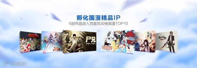 腾讯动漫一直致力于构建业界最大的体系,我们培育了一大批用户,图上的6个作品都进入了百度风云排行榜TOP10的作品,近期我们有一部新作品,叫《一人之下》在日本播出,现在能进到国漫排行榜的前10名。