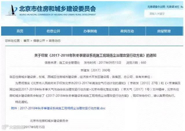 北京市住建委发布《2017-2018年秋冬季建设系统施工现场扬尘治理攻坚行动方案》,从2017年11月15日至2018年3月15日,也就是采暖季期间,北京市东城区、西城区、朝阳区、海淀区、丰台区、石景山区全部区域;通州区、大兴区、房山区、门头沟区、延庆区、昌平区、怀柔区、密云区、平谷区、顺义区、亦庄经济技术开发区城区及建成区要停止各类道路工程、水利工程等土石方作业和房屋拆迁施工等。