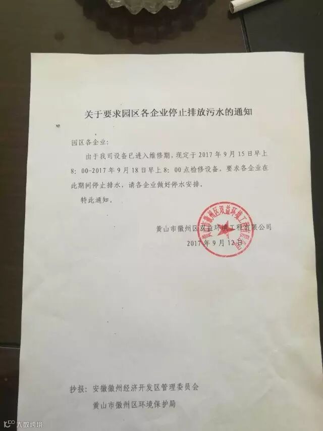 日前,安徽黄山市徽州区双益环境工程有限公司发布通知:定于9月15日早上8:00-9月18日早上8:00检修设备,要求各企业在此期间停止排水,请各企业做好停水安排。