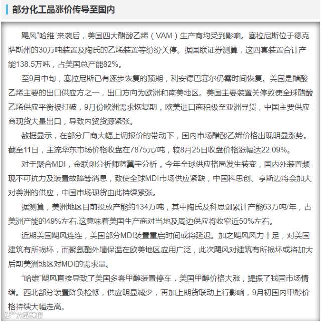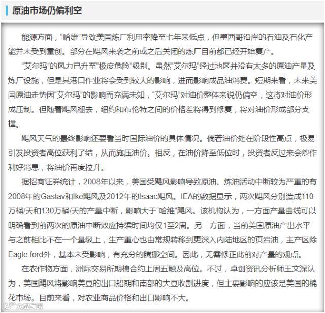 与此同时,商品交易员也需要面对“不眠之夜”。刚刚经历了飓风“哈维”的冲击,多个因不可抗力而停产的重要原材料生产基地完全恢复尚需时日。如今,“艾尔玛”究竟会带来多少损失尚不得而知,但商品市场的波动恐仍难平复。