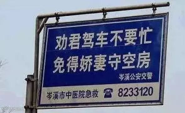 这绝对是段子手语录啊,这说的是,开车需谨慎,万一出了事,娇妻就只能独守空房了。