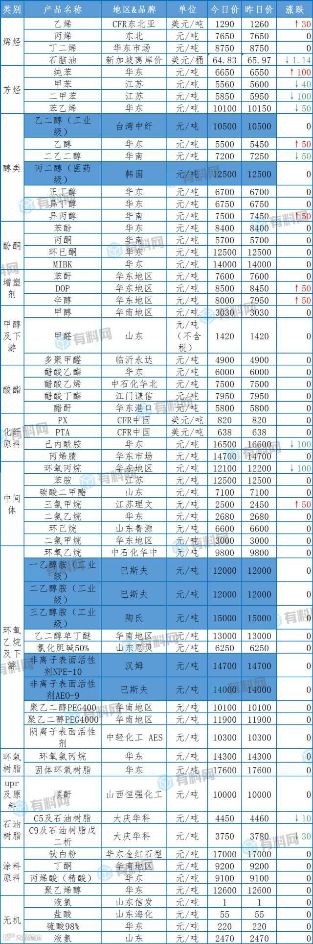 扬子石化、上海石化上调出厂价200元,独山子石化上调出厂价150元,目前出厂价在5900-7050元/吨;市场价全线上涨30-50元,目前市场价在7050-7200元/吨。虽然市场价上涨幅度较之前有所下降,但今日出厂价开始上调,势必会影响市场价,短期内二乙二醇将继续小幅上涨,“最严停工令”实施后,不出意外会大涨。