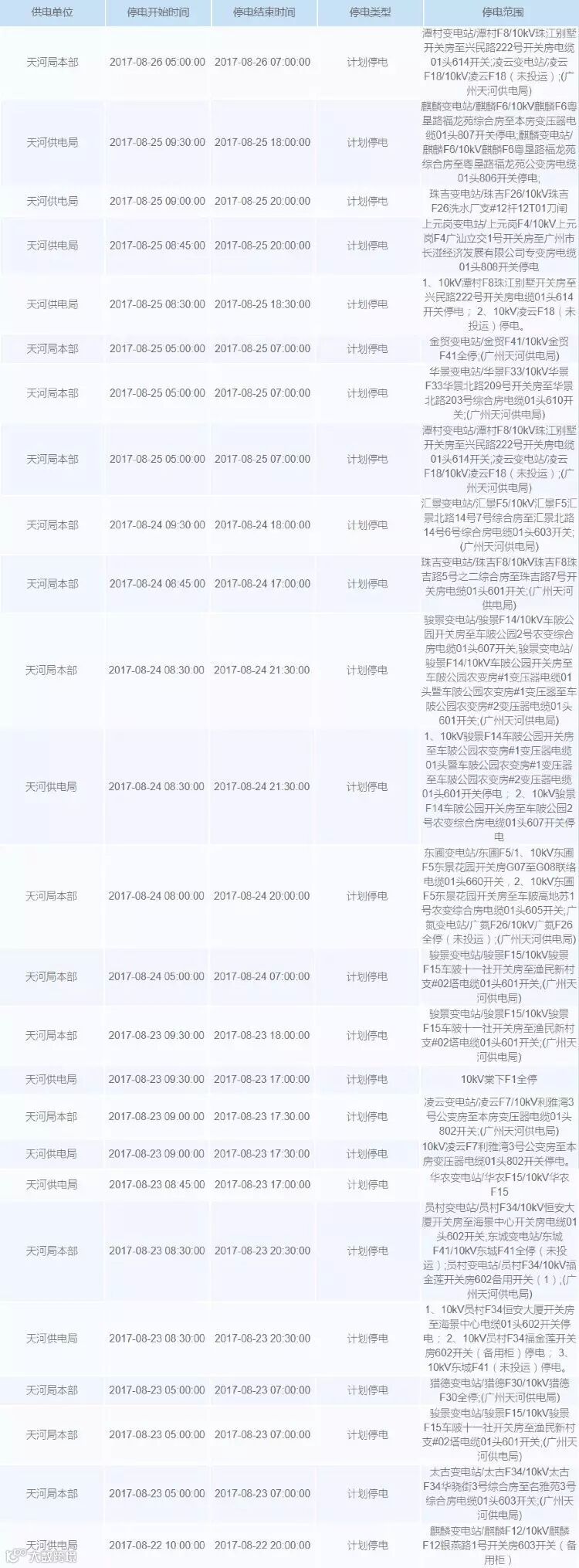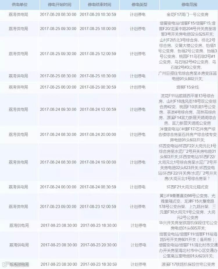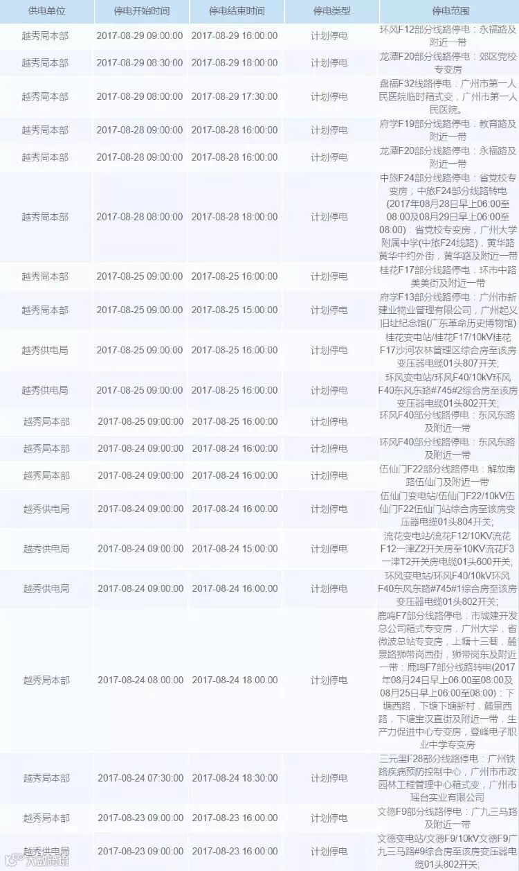 未来一周广州计划停电安排如下
