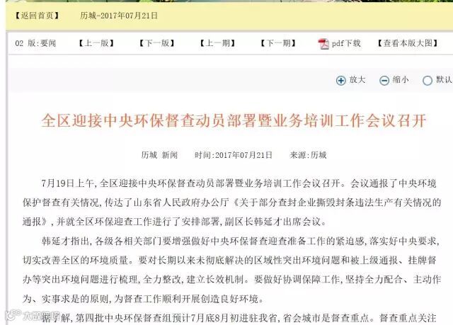 7月19日上午,济南市历城区迎接中央环保督查动员部署暨业务培训工作会议召开,会议通报了中央环境保护督查有关情况。据了解,第四批中央环保督查组预计7月底8月初进驻我省,省会城市是督查重点。督查重点关注被督查地方突出环境问题及处理情况、人民群众反映的身边环境问题的立行立改情况等。督查结果将移交中央组织部,作为干部考核任免的重要依据。(王秀亮)