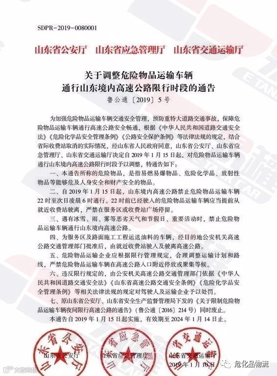 本通告自2019年1月15日起实施,有效期至2024年1月14日止。请广大危险物品运输企业合理调整运输计划和路线。