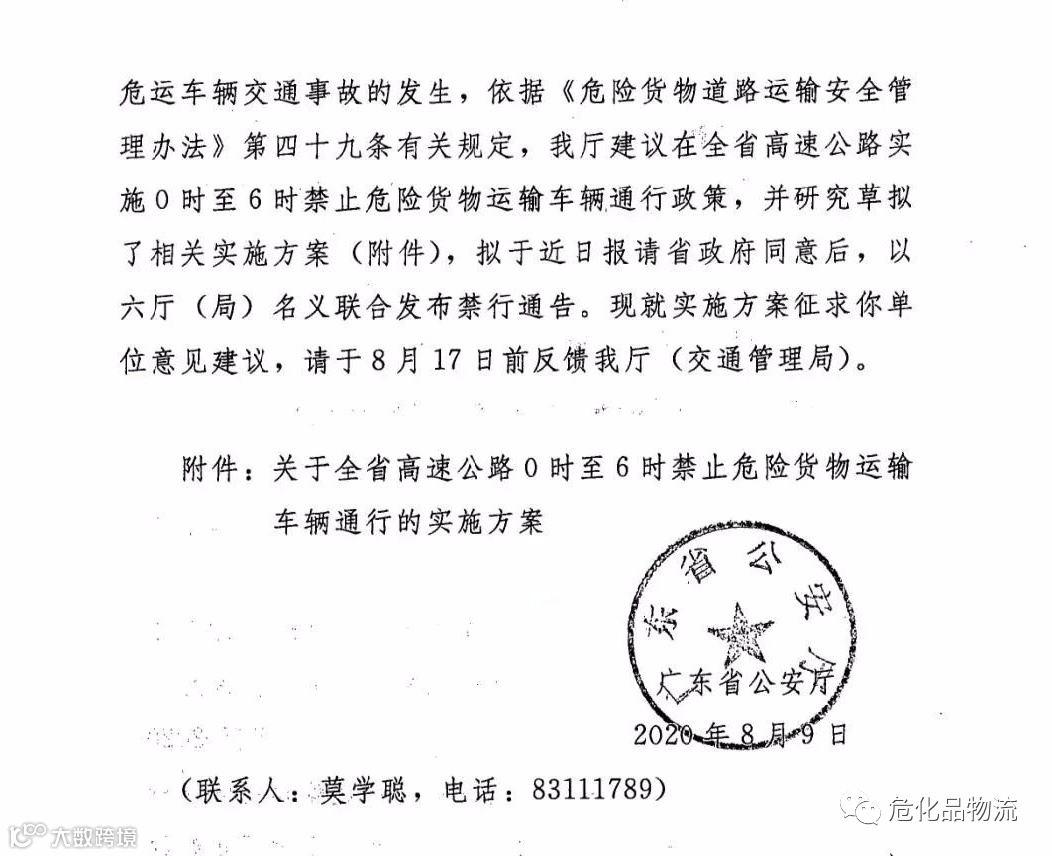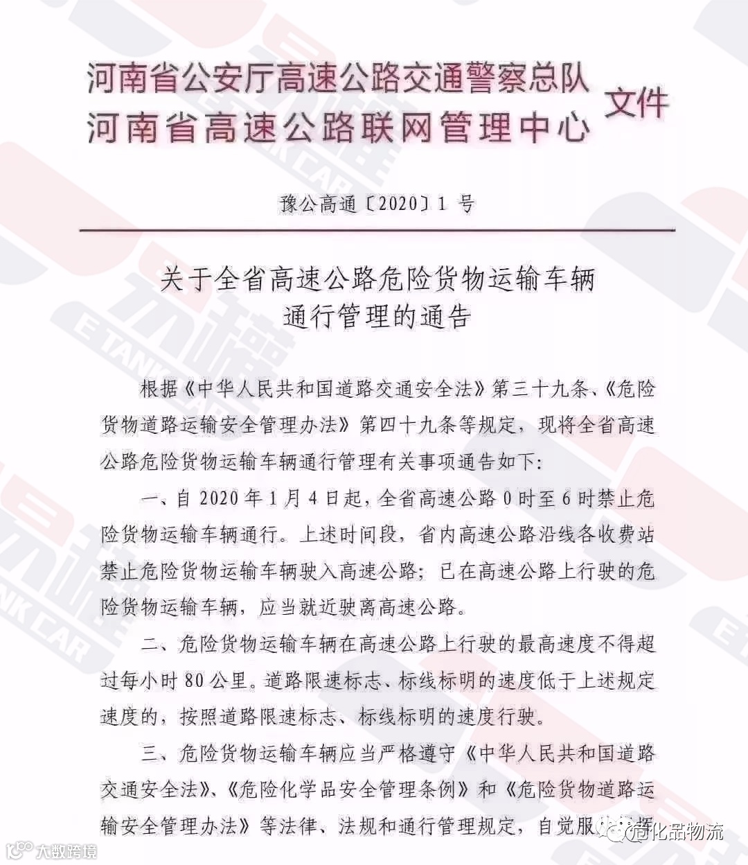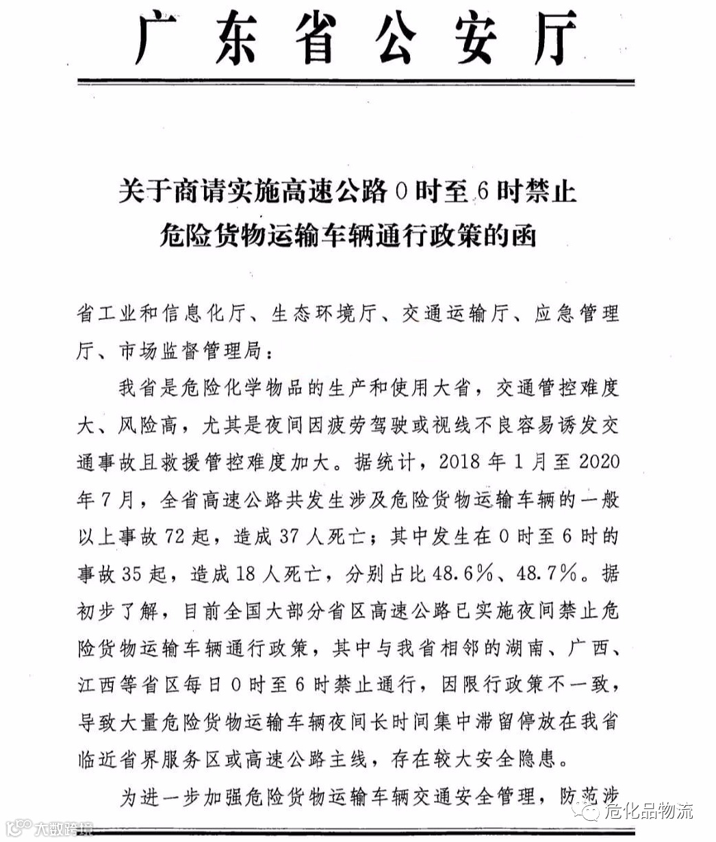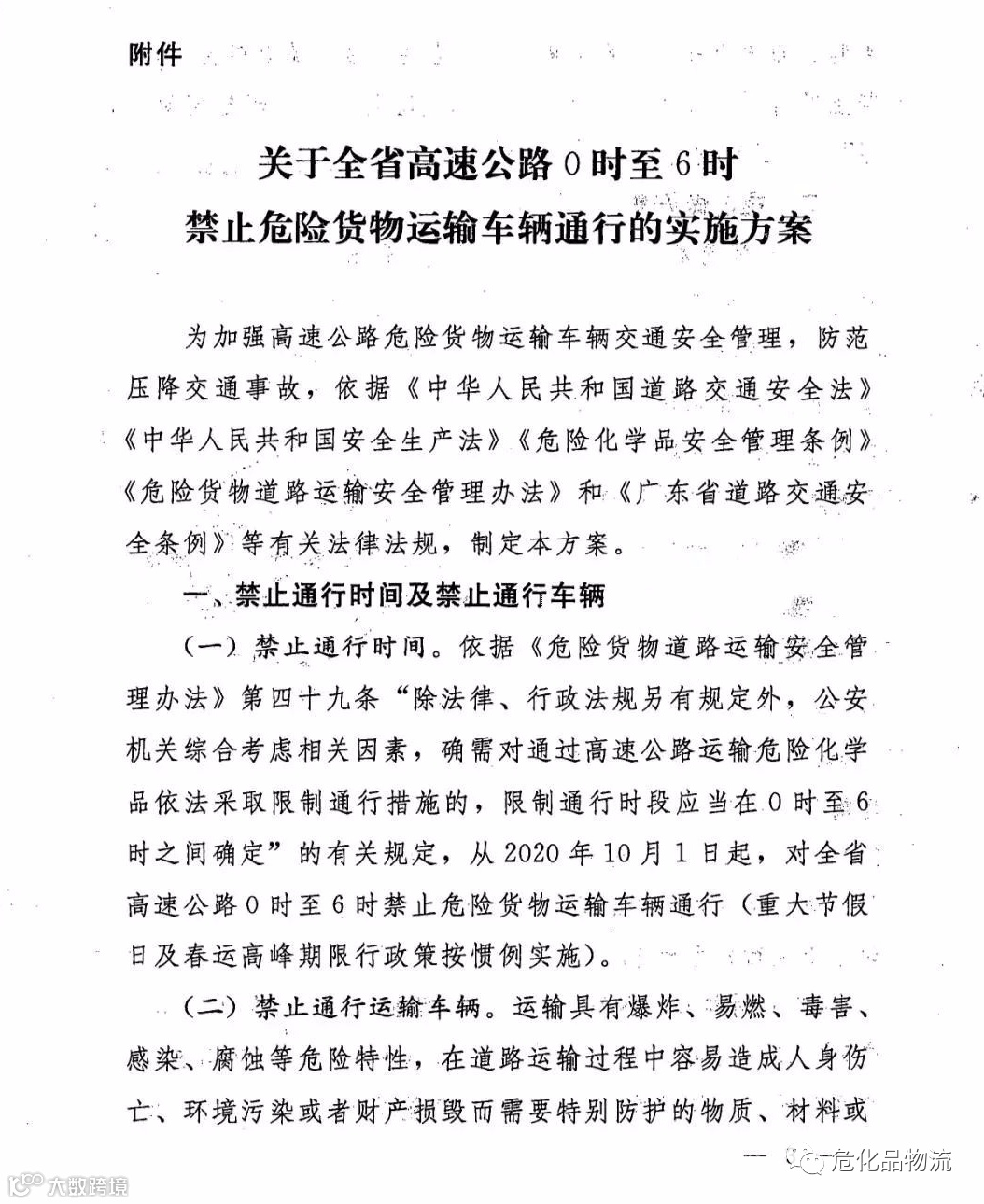 自2020年10月1日起,对全省高速公路0时至6时禁止危险货物运输车辆通行