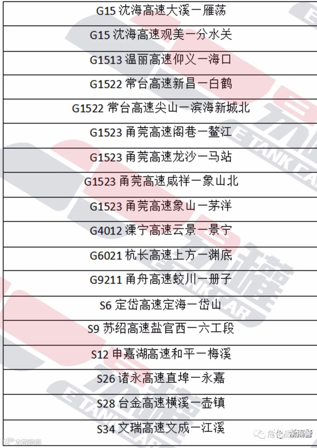 杭州湾跨海大桥0点至6点禁行危险物品运输车辆;东永高速;云景高速;甬台温高速分水关至观美、大溪至雁荡;上三高速新昌至白鹤;金丽温高速公路丽水海口至仰义;嘉绍大桥、甬舟跨海大桥、象山港大桥;诸永高速全线;台金高速壶镇至横溪(苍岭隧道);钱江通道(过江隧道段);宁波绕城高速沙河、九龙湖;杭甬高速宁波(段塘)、大朱家;甬台温高速宁波东;之江大桥危化品车均禁止通行。