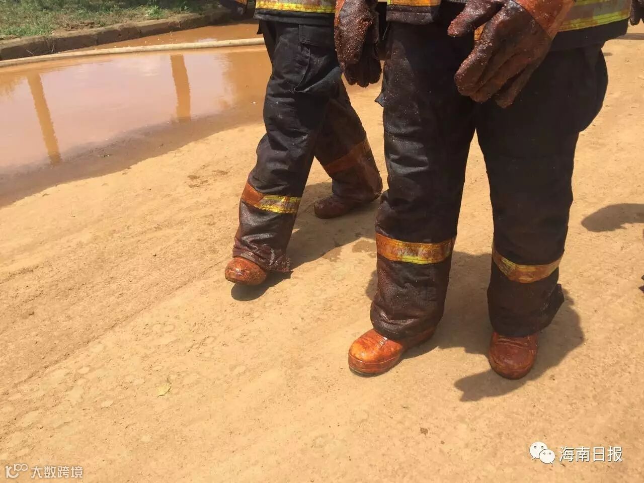 消防官兵脚上沾满油漆。