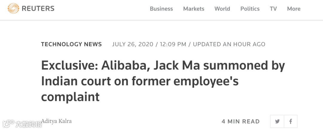 路透社26日报道称,一份印度法院的文件显示,印度首都新德里的一家法院因一起诉讼案,已对阿里巴巴创始人马云()Jack Ma)作出传唤。