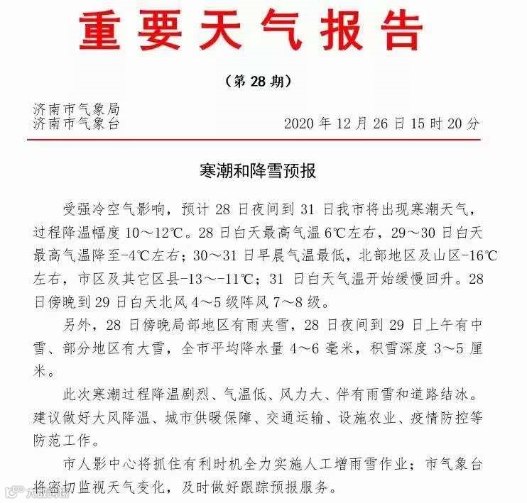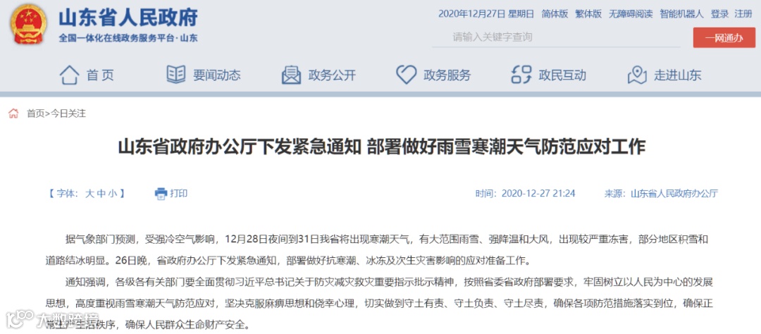 26日晚,山东省政府办公厅下发紧急通知,部署做好抗寒潮、冰冻及次生灾害影响的应对准备工作。