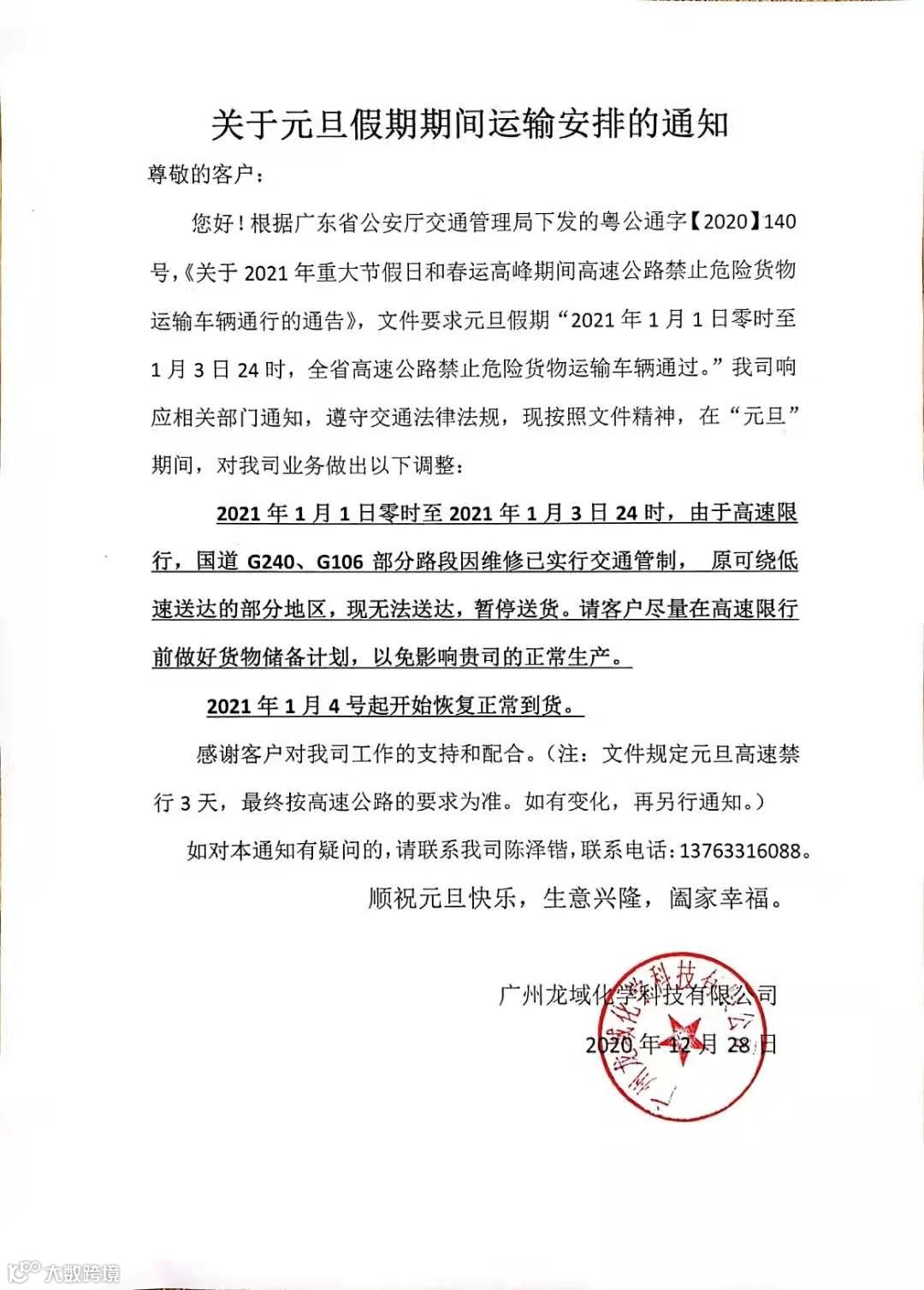 根据广东交通运输厅的最新通知,元旦假期:2021年1月1日0时至2021年1月3日24时。禁止危险货物运输车辆在广东行政区域内高速公路通行。