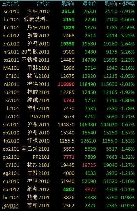 受原油大暴跌影响,9月9日国内期货市场开盘,商品期货多数下跌,能源化工大幅下跌,原油期货开盘跌停,燃油、LU跌超4%,沥青跌逾3%,郑醇、橡胶等跌超2%,PTA、PP等跌超1%。