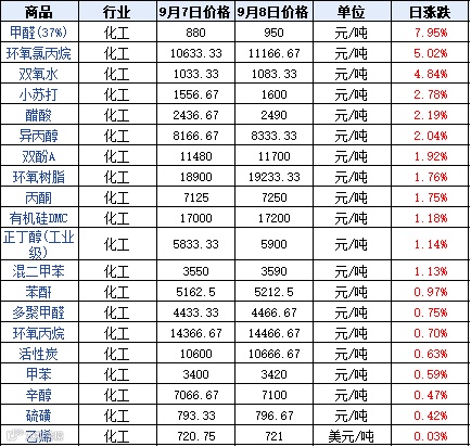 根据最新行情检测,2020年9月8日大宗商品价格涨跌榜中化工板块环比上升的商品共20种,日均涨跌幅为0.29%。