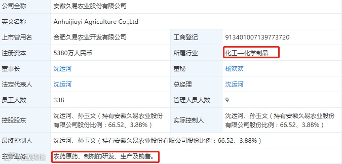 公开资料显示,安徽久易农业有限公司经营范围包括,农药原药、制剂的研发、生产及销售。