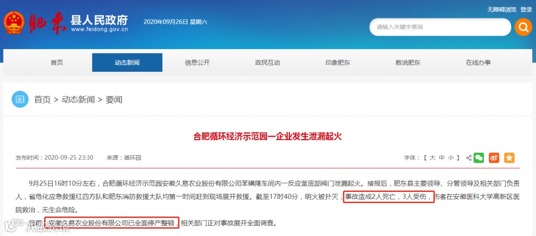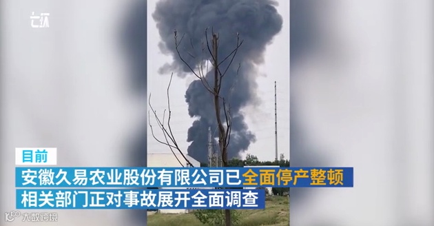 据肥东县人民政府通报:目前,安徽久易农业股份有限公司已全面停产整顿,相关部门正对事故展开全面调查。