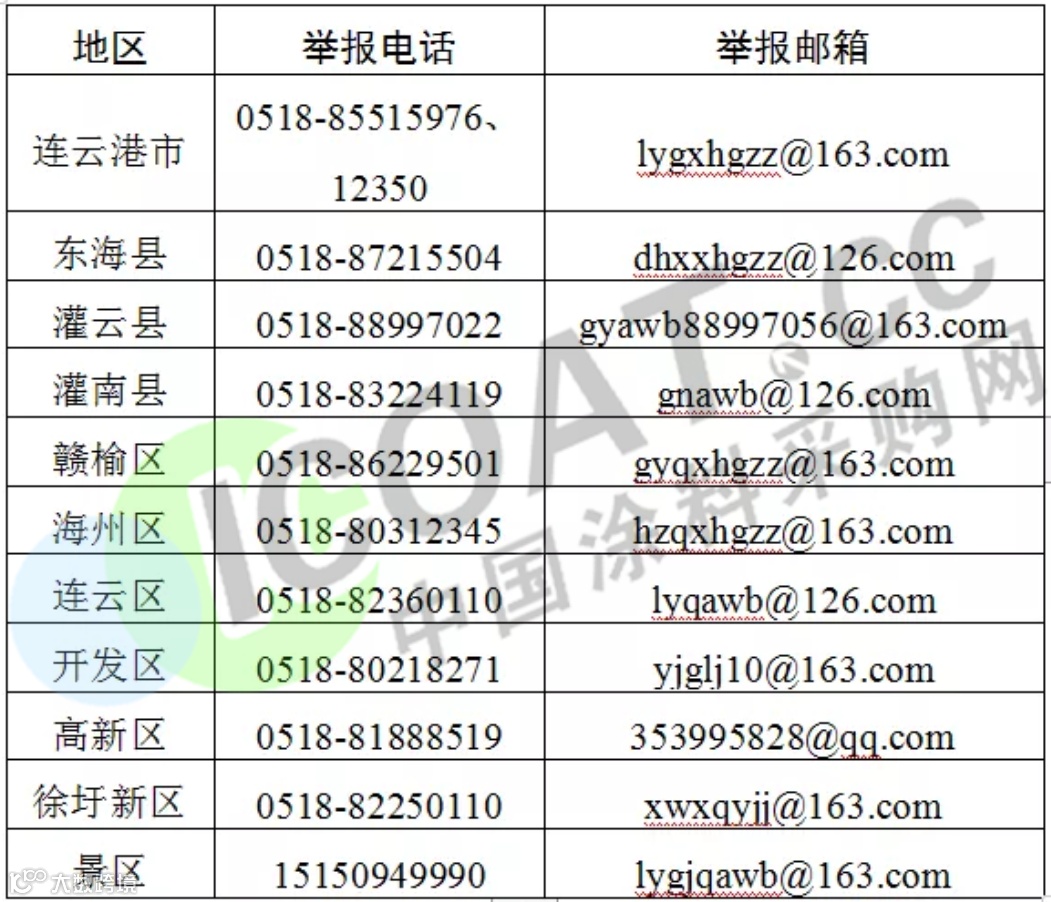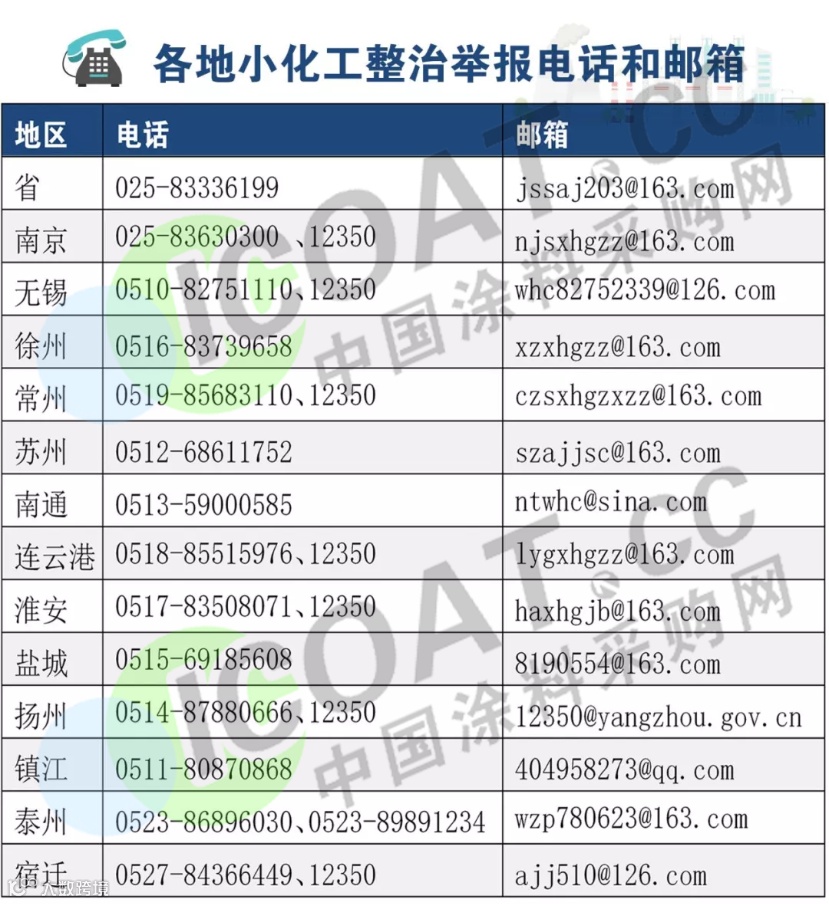 除了各地区各部门对违法违规“小化工”彻底排查外,江苏省安委会办公室还于6月2日向社会公布了违法违规百日“小化工”专项整治行动省及各设区市举报方式,要求强化社会监督,欢迎广大群众对身边的违法违规化工生产、经营、储存的企业、单位和个人及相关场所予以举报,对举报信息核查属实的个人或单位将根据有关规定给予2至10万元的奖励。附各个地区举报电话: