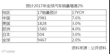 中国产业发展研究网预计,2017年全球汽车销量稳健增长,中国依旧为全球市场主要增量来源。预计2017年中国汽车销量2981万辆(+7.6%),其中乘用车销量2610万辆(+8.1%),SUV销量1042万辆(+18%)。