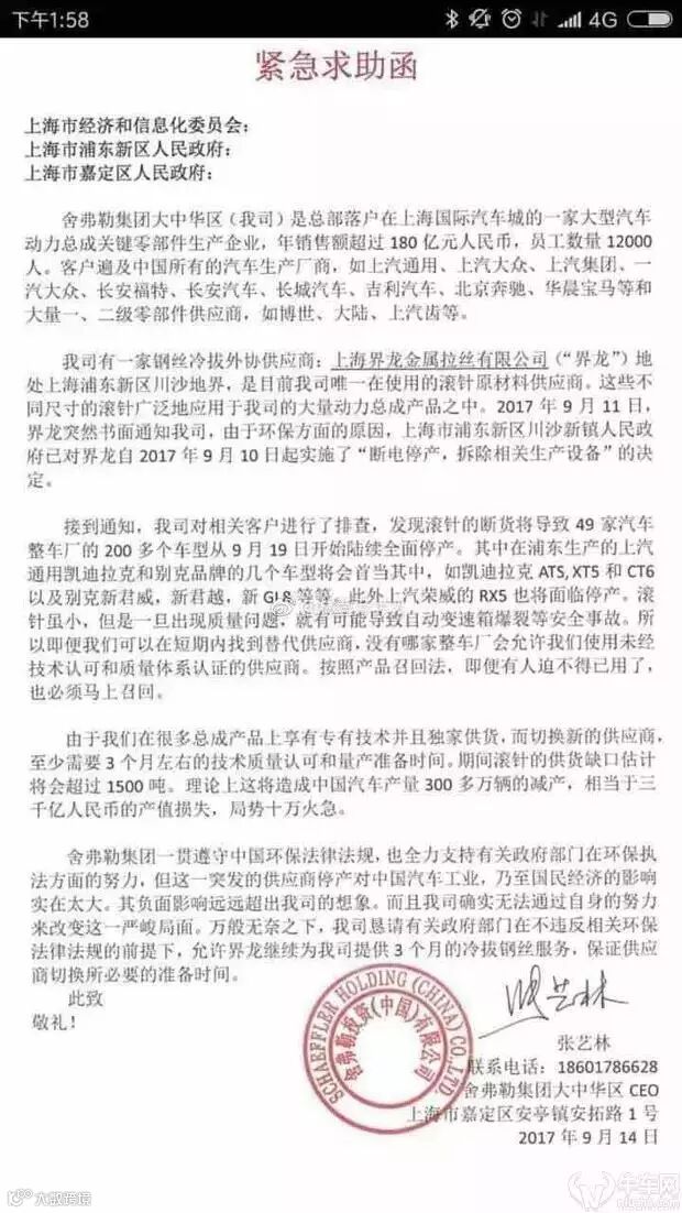 舍弗勒大中华区CEO 张艺林博士向上海市经信委、浦东新区政府和嘉定区政府求援,希望为其上游钢丝冷拔外协供应商界龙的环保事宜网开一面。
