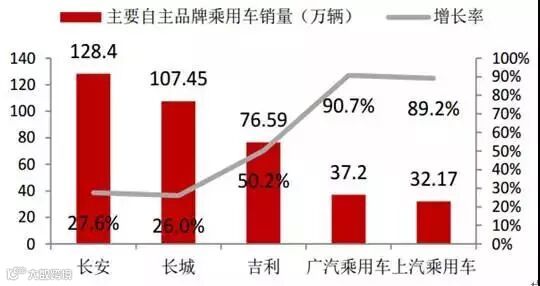 2016年乘用车销量2437.7 万辆,其中自主品牌乘用车销量1052.9万辆,增长 20.5%,增幅大于乘用车总体增速,市场占有率也由2015年的41.14%增长到2016年的43.20%。自主品牌乘用车产品质量稳步提升,并逐步建立研发流程、标准和体系,获得市场认可,尤其是各大自主车厂热销SUV车型带动了整体销量提升。据中汽协数据统计,2016年 SUV 销量前10中自主品牌占据6席。