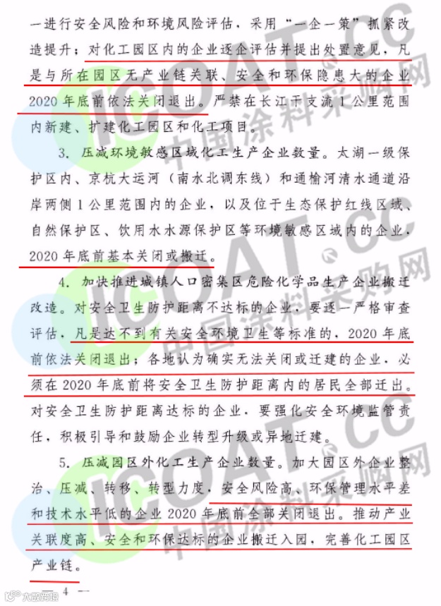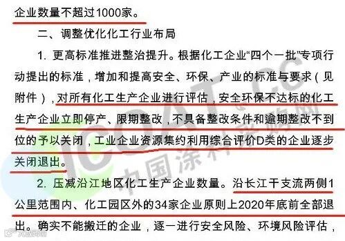 而后在4月27日,江苏省人民政府办公厅正式印发《江苏省化工产业安全环保整治提升方案》(以下称“《方案》”),此次《方案》正式稿中,虽然删除了几处削减化工企业数量的数字,但依然明确提出要关闭安全和环保不达标、风险隐患突出的化工生产企业,并且就方案整体而言,依然体现出江苏省对化工产业“全方位、全过程整治和全面提升”的决心和力度,且规定了关闭退出或搬迁等措施的重要节点为2020年底前。