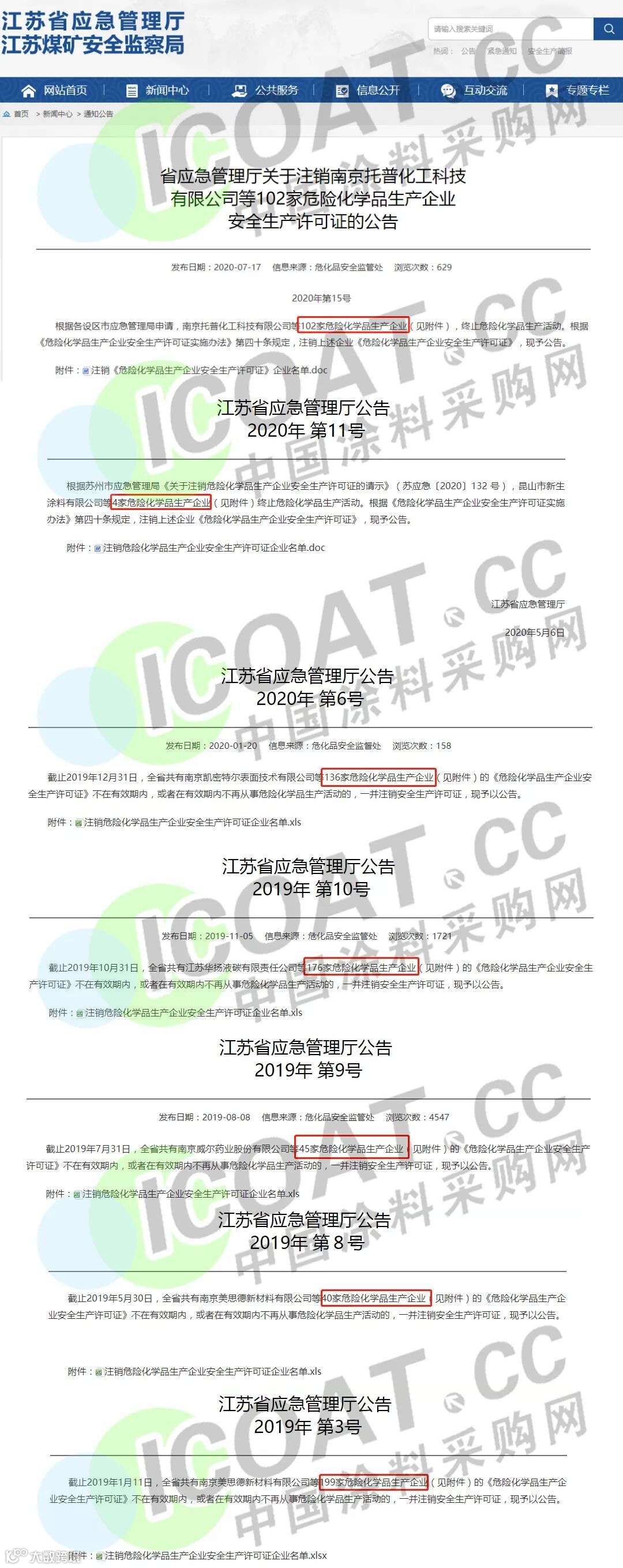 据涂料采购网获悉,江苏省应急管理厅曾多次发布公告,对安全生产许可证注销的危险生产企业进行公告,近几年累计注销近千家。