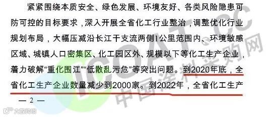 该方案指出,到2020年底,江苏省化工生产企业数量减少到2000家,到2022年,全省化工生产企业数量不超过1000家;沿长江干支流两侧1公里范围内、化工园区外的34家企业原则上2020年底前全部退出;
