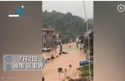湖南张家界赵家岗新安村暴雨引发山洪灾害,小汽车卷入洪流中,所幸司机得以爬窗逃生。