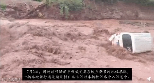 云南武定县东坡乡勐果河水位暴涨,小汽车被冲入河道之中。