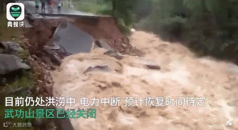 江西山洪造成大面积电杆被冲倒,电力中断,道路被毁。
