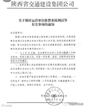 4月12日陕西省交通建设集团公司通知:4月15日起,各运营单位全体人员停止弹性工作制及轮休,恢复正常上班,运营一线收费、监控、治超等岗位恢复原班次运转模式。