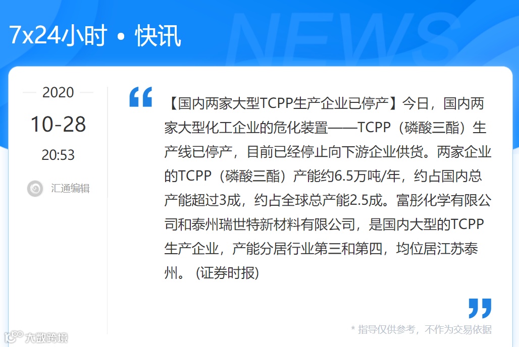10月28日,国内两家大型化工企业,富彤化学有限公司和泰州瑞世特新材料有限公司的危化装置——TCPP(磷酸三酯)生产线已停产,目前已经停止向下游企业供货。