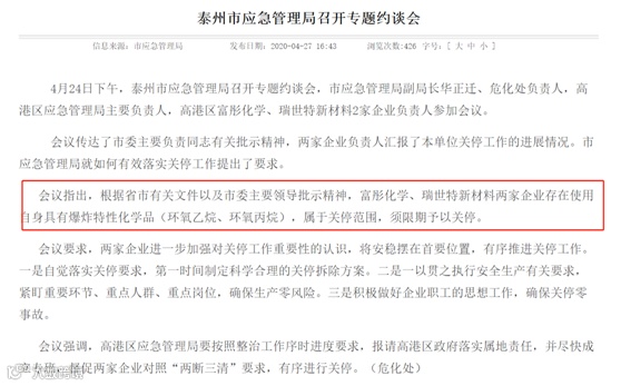 早在2020年4月24日下午,泰州市应急管理局就曾召开专题约谈会,约谈富彤化学、瑞世特企业负责人。会议指出,富彤化学、瑞世特存在使用自身具有爆炸特性化学品(环氧乙烷、环氧丙烷),属于关停范围,须限期予以关停。