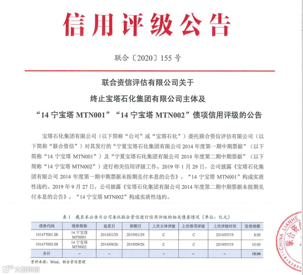 在宝塔集团的两只债券“14宁宝塔MTN001”、“14宁宝塔MTN002”均已构成实质性违约且无后续进展的情况下,联合资信决定终止对宝塔集团主体及两只债券的债项信用评级。而宝塔集团这家西部的民营能源巨无霸,如今已被列为失信被执行人。