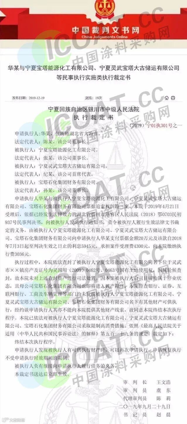 2019年12月20日,记者自裁判文书网获悉,宁夏回族自治区银川市中级人民法院于今年9月作出了(2019)宁01执301号之一执行裁定,该文书显示,宝塔石化集团有限公司即将进入破产程序,宝塔石化集团财务有限公司等名下已无其他财产可供执行。