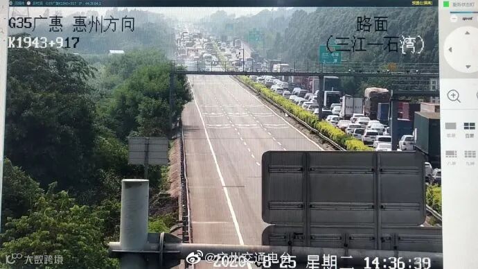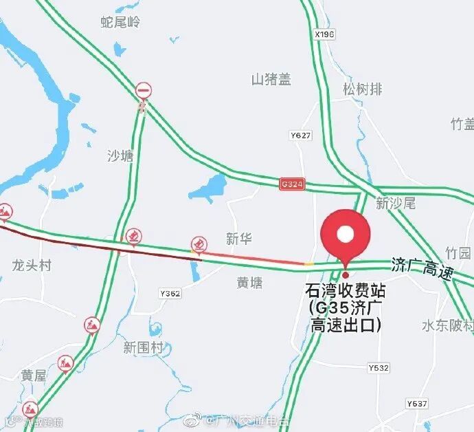 15时45分,出于安全考虑,惠州交警对广惠高速公路往广州方向车道实施交通管制,目前,该路段双向封闭。广惠高速公路往广州方向石湾站出口分流、入口封闭,车辆可提前在园洲站下高速,绕行国道至三江站再上高速。