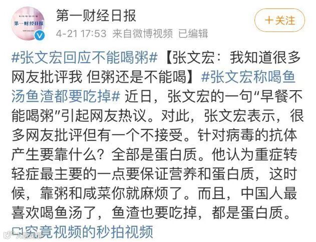 张文宏回应不能喝粥:我知道很多网友批评我,但粥还是不能喝
