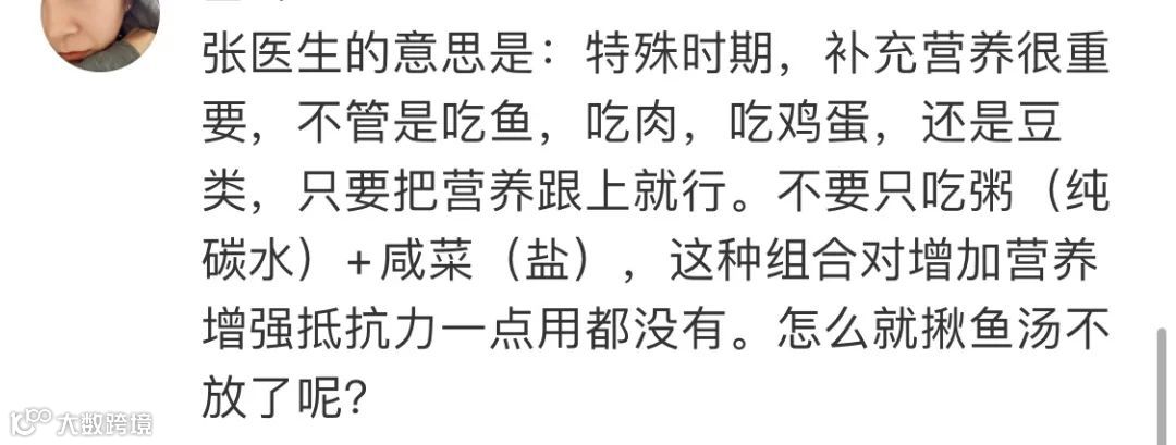 他认为重症转轻症最主要的一点要保证营养和蛋白质,这时候,靠粥和咸菜你就麻烦了。而且,中国人最喜欢喝鱼汤了,鱼渣也要吃掉,都是蛋白质。